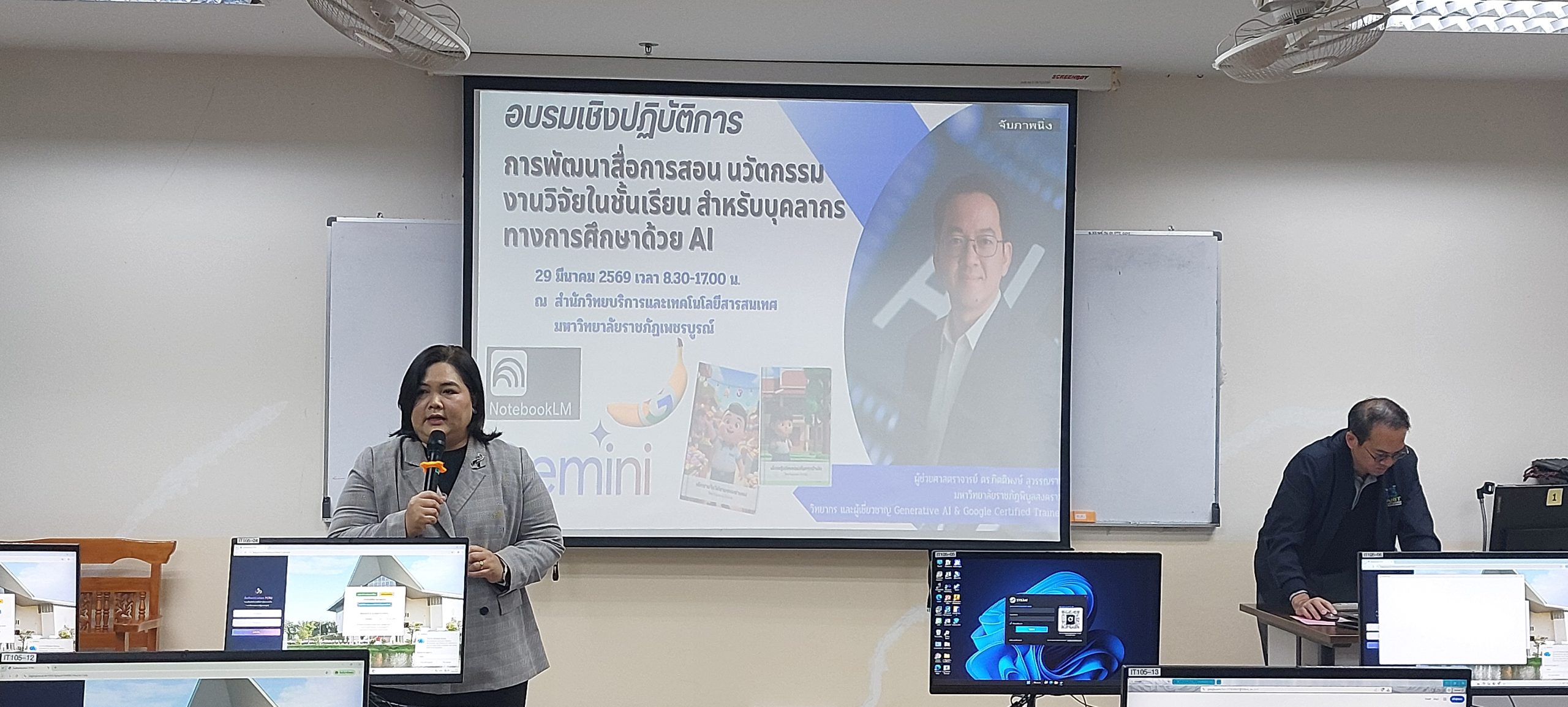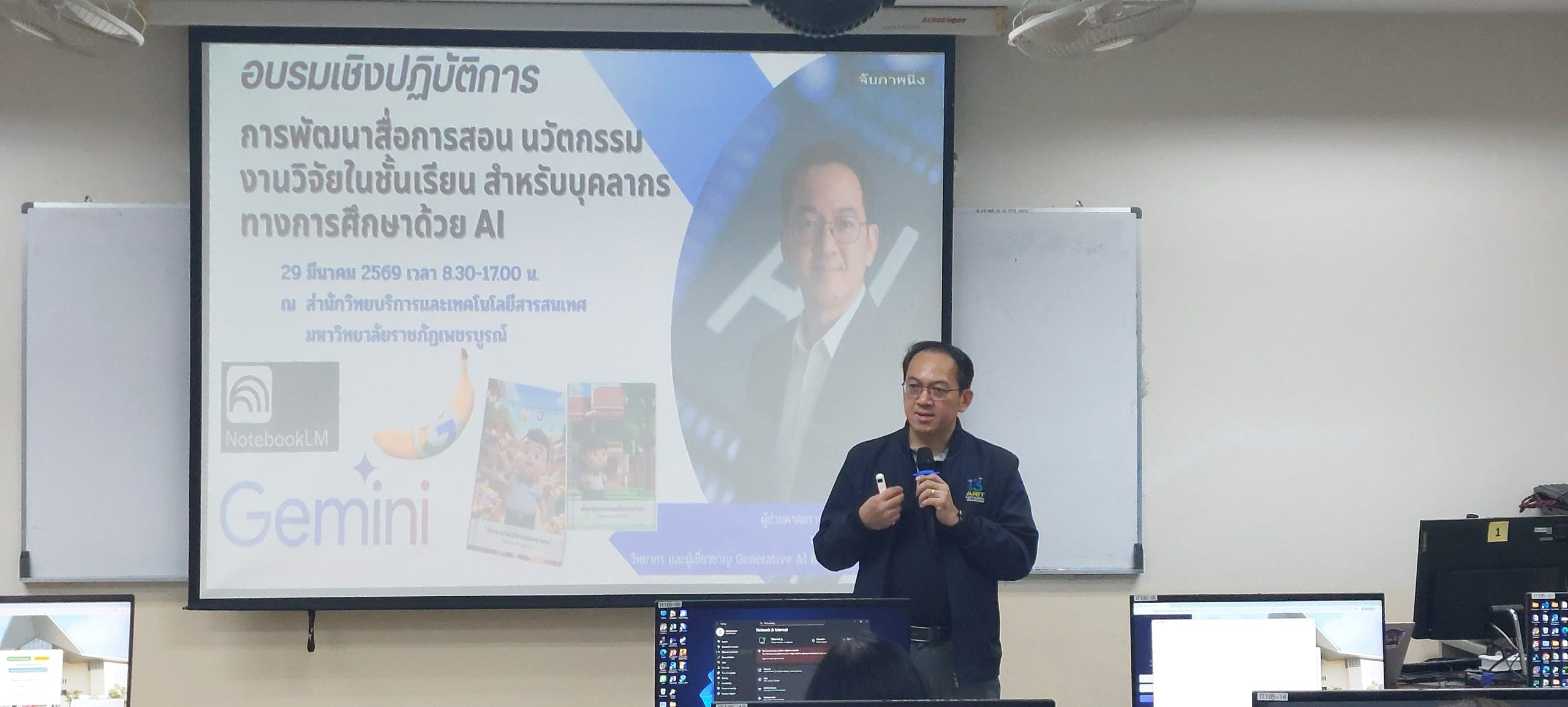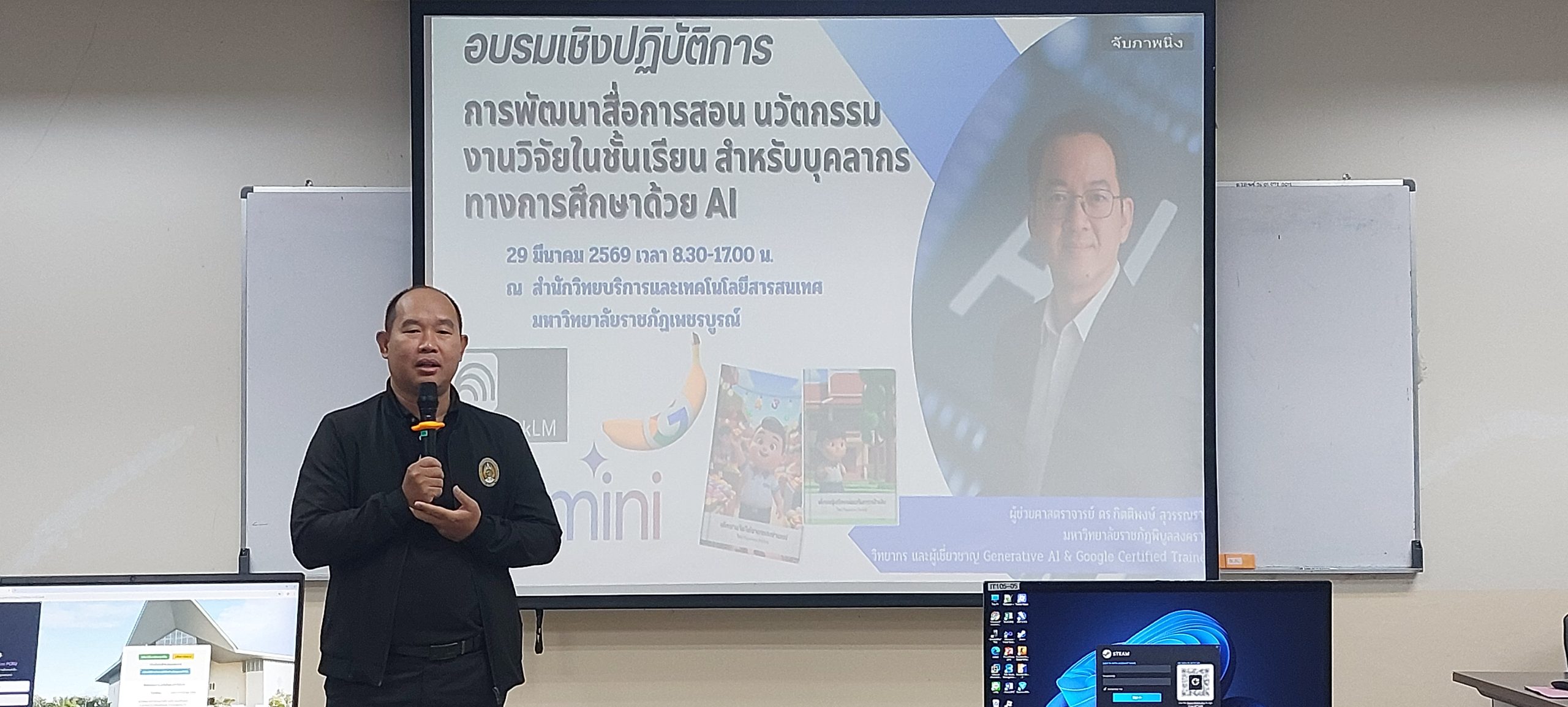 วันที่ 29 มีนาคม 2569 งานหอสมุดกลาง สำนักวิทยบริการและเทคโนโลยีสารสนเทศ จัดโครงการอบรมเชิงปฏิบัติการ การพัฒนาสื่อการสอนนวัตกรรมงานวิจัยในชั้นเรียนด้วย AI รุ่นที่ 2 ณ ห้องปฏิบัติการคอมพิวเตอร์ IT105 อาคารเทคโนโลยีสารสนเทศ สำนักวิทยบริการและเทคโนโลยีสารสนเทศ มหาวิทยาลัยราชภัฎเพชรบูรณ์ โดยมี ผู้ช่วยศาสตราจารย์ ดร.กิตติพงษ์ สุวรรณราช อาจารย์ประจำคณะวิทยาศาสตร์และเทคโนโลยี มหาวิทยาลัยราชภัฏพิบูลสงคราม เป็นวิทยากร และมีผู้เข้าร่วมโครงการเป็นครู อาจารย์ และบุคลากรทางการศึกษา ในเขตอำเภอเมือง จังหวัดเพชรบูรณ์